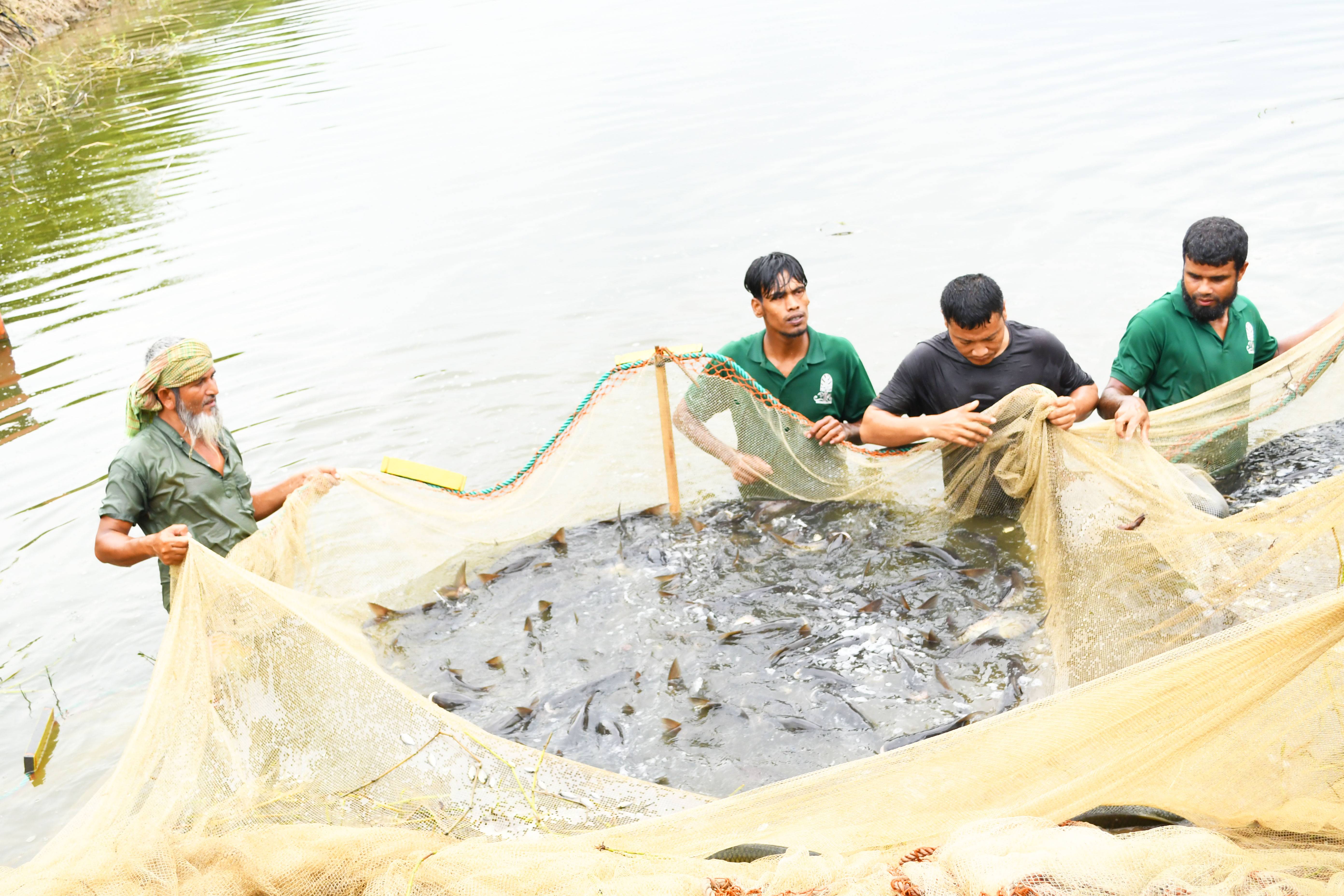 Nine large ponds hosting native and exotic fish species like Rui, Katla, Silver Carp, and Shrimp — where visitors can participate in feeding and harvesting.